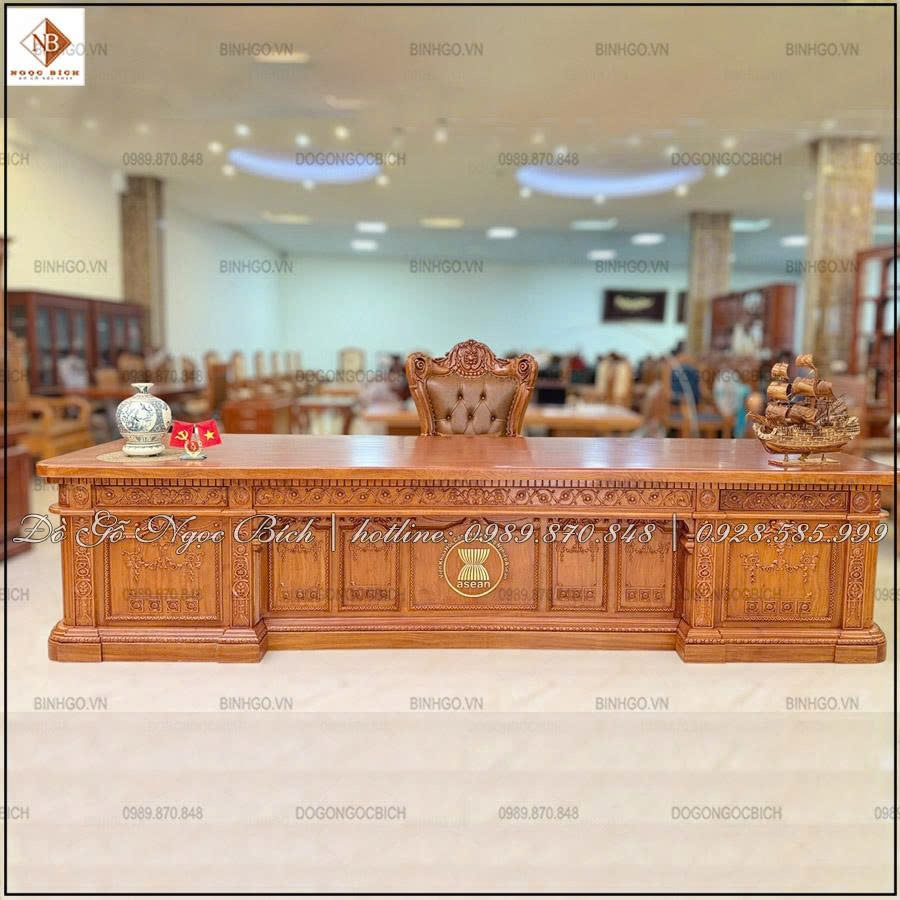 Chiếc bàn làm việc mẫu Tổng Thống Mỹ dài 3m60 không chỉ là nội thất văn phòng, mà còn là biểu tượng của quyền lực, sự uy nghiêm và đẳng cấp lãnh đạo. Với chất liệu gỗ gõ đỏ quý hiếm, thiết kế tinh xảo và chi tiết khắc logo ASEAN dát vàng, sản phẩm này chắc chắn sẽ nâng tầm không gian phòng làm việc của bạn.