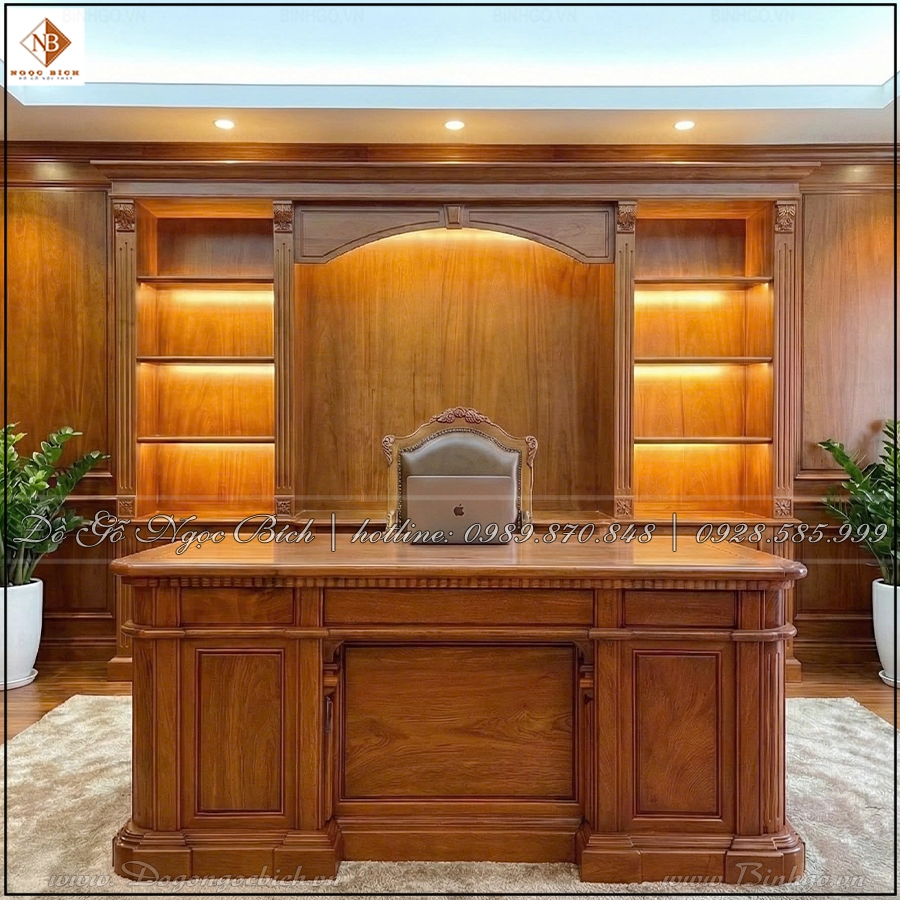 Với xu hướng 2026, các mẫu bàn gỗ tự nhiên – đặc biệt là gỗ gõ đỏ, hương, cẩm – vẫn giữ vị trí dẫn đầu. Tùy vào phong cách văn phòng, khách hàng có thể chọn bàn nguyên khối, bàn tân cổ điển hoặc bàn hiện đại tối giản.